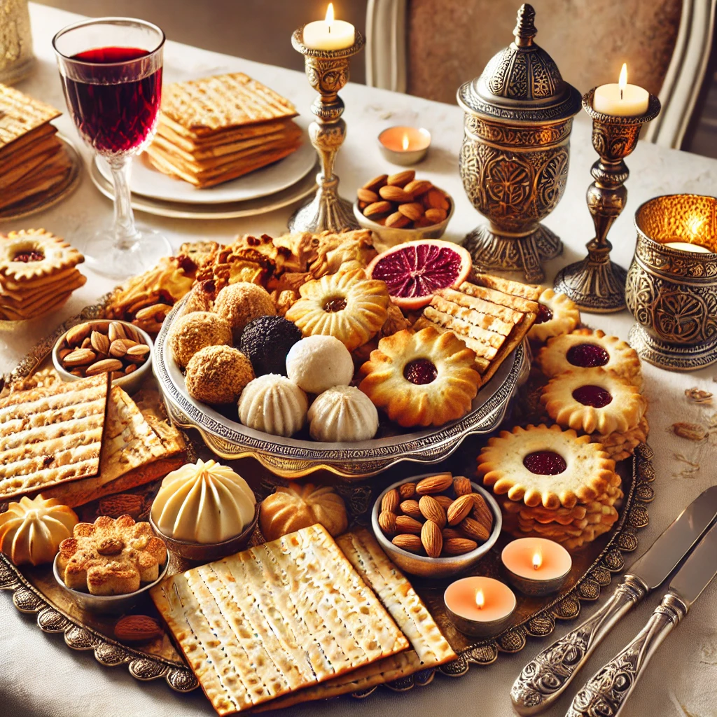 HomeAccueilDALL·E 2025-03-17 10.21.56 – A beautifully set Passover (Pessah) table featuring an assortment of traditional Jewish dry cookies and pastries. The table includes elegant tableware